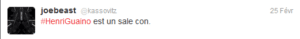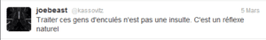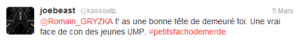 Si NS passe un deuxième tour la France est un pays de collabo néo-fasciste. Il faut se débarrasser de ces fils de putes de l’UMP avec fracas, a-t-il déclaré sur son compte Twitter.